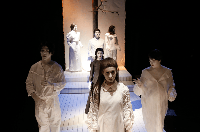 La escenografía a cargo de Elizabeth Perez, Sebastián Escalona y José Miguel Carrera, es minimalista pero está bien ejecutada, ya que está compuesta de manera tal que ninguno de los detalles de su factura es arbitrario. Sobre el escenario se despliega una estructura blanca que hace de pared de fondo, y a sus pies cuenta con unos escalones del mismo color en tres niveles de altura. Frente a la pared, a modo de jardinera, se alza un Peumo seco, como si hubiese sido consumido por las llamas. En dicha estructura transcurren los acontecimientos en una escala de blancos, grises y negros, la piel de los actores está cubierta hasta la punta de los dedos de un tono espectral que contribuye a la atmósfera onírica en la que está envuelta la obra. Del mismo modo lo hace el vestuario -compuesto por Javiera Silva-, ya que todos los personajes están vestidos de riguroso blanco con ropajes drapeados. La indumentaria remite al imaginario de una familia conservadora, blusas sin escote, faldas hasta la rodilla, zapatos de vestir, pero con un vuelco hacia la rebelión que ansían los personajes, hombres de pelo largo, labios de rojo carmín y camisa abierta. Finalmente, lo que termina de sellar la ambientación de este lugar extraño e inhóspito es la musicalización compuesta por Alejandro Miranda especialmente para este montaje.