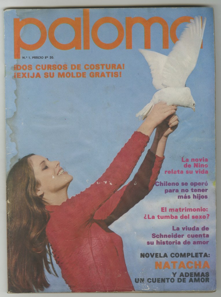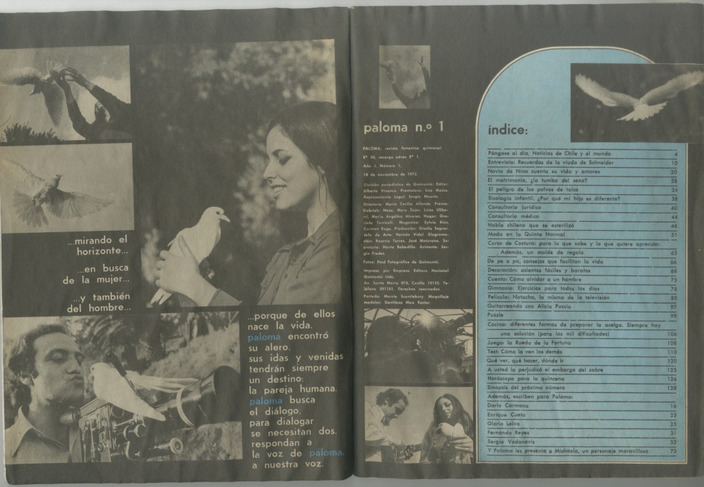 La revista Paloma a cargo de la editorial nacional Quimantú, logró producir 22 números entre noviembre de 1972 y septiembre de 1973, dirigida a las mujeres obreras y aquellas dedicadas a las labores del hogar, en definitiva, sujetos que trabajan por el mejoramiento de la patria (Barr-Melej 234). Entre algunas de las secciones presentes en Paloma se encuentran en los ejes de “hogar”, espacio dedicado a la difusión de recetas de fácil acceso y preparación, pensado en una forma de alivianar la carga de las labores, entre otros temas como clases de tejido, jardinería o decoración. Por su parte, el apartado “Palomitas” proporciona columnas de entretenimiento a través de puzzles, chistes, horóscopo o test para realizar. En “moda” se destaca el acceso a un curso básico de costura, impulsado por la Escuela de alta costura del Ministerio de Educación, librillo incluido desde el primer número hasta el 15, el cual promueve el ahorro y el uso de los medios propios para la confección de prendas, entre otras ideas dentro del cuerpo de la revista como diseños para decorar el hogar que prometen estar “al alcance de la mano”, “sin gastar demasiado” (68) o ideas de recetas que facilitan a la dueña del hogar la labor cotidiana.